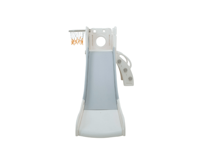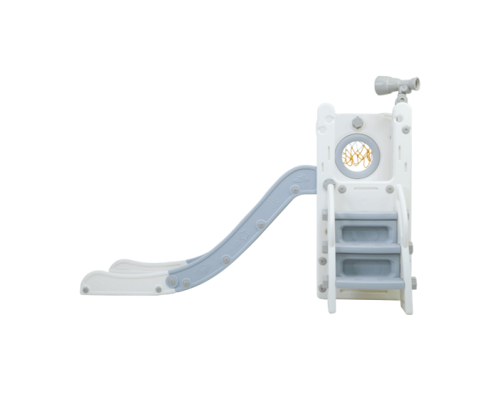 Com 1 torre que inclui escorregador, cesta de basquete, luneta e guarda-brinquedos.