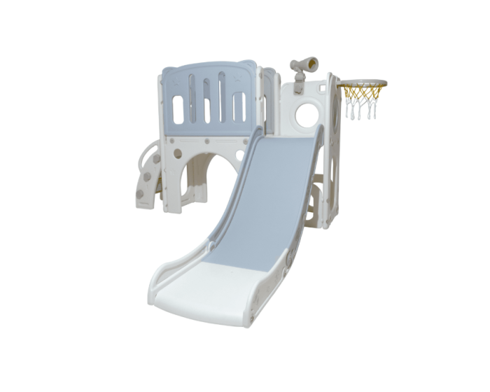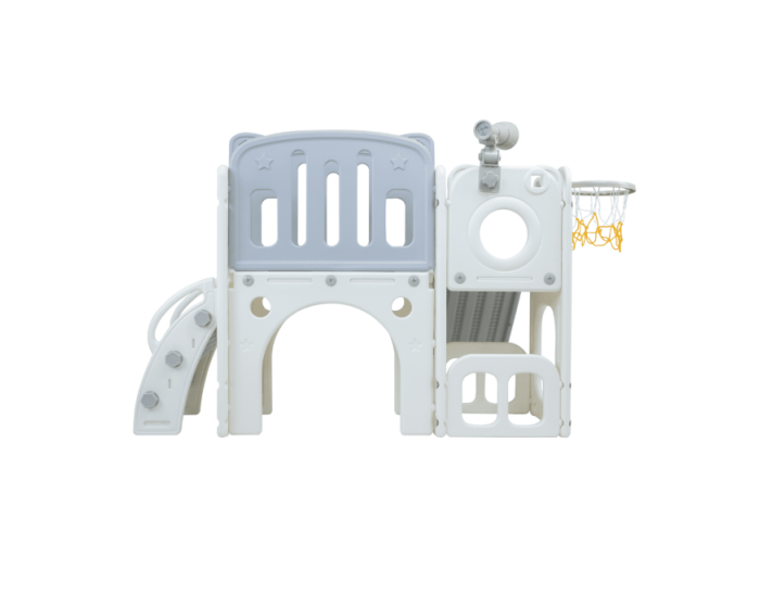 Com 2 torres que incluem escorregador, cesta de basquete, luneta e guarda-brinquedos.