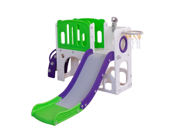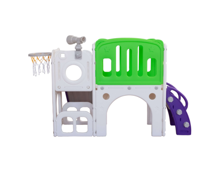 Com 2 torres que incluem escorregador, cesta de basquete, luneta e guarda-brinquedos.