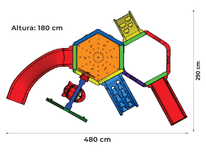 1 módulo maior com paredes de 1,85m de altura, rampa de escalada com passagem para 1 criança por vez (segurança), escorregador curvo com sustentação feita por um postinho com rosca para fixação segura , parede com vazados verticais, parede com arco de proteção acoplado, uma plataforma sextavada com drenos para evitar acúmulo de água1 balanço Jet em forma de jatinho conectado à parede através de um tirante horizontal e um conector instalado na lateral da parede com um timão que gira de verdade, 1 peça em forma de cavalete..